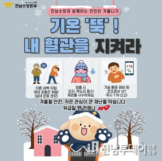전남투데이 김용희 기자 | 전남소방본부(본부장 주영국)는 최근 기온이 급격히 떨어지는 한파가 이어지면서 심근경색, 뇌졸중 등 심뇌혈관 질환 발생 위험이 높아짐에 따라 도민들의 각별한 주의를 당부했다.