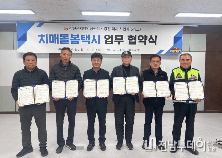 전남투데이 박동운 기자 | 강진군보건소(강진군치매안심센터)가 지난 27일 치매환자와 이동이 불편한 주민들의 편의를 높이기 위해 관내 개인택시사업자 5명과‘ 치매돌봄택시’ 송영서비스 업무협약을 체결했다
