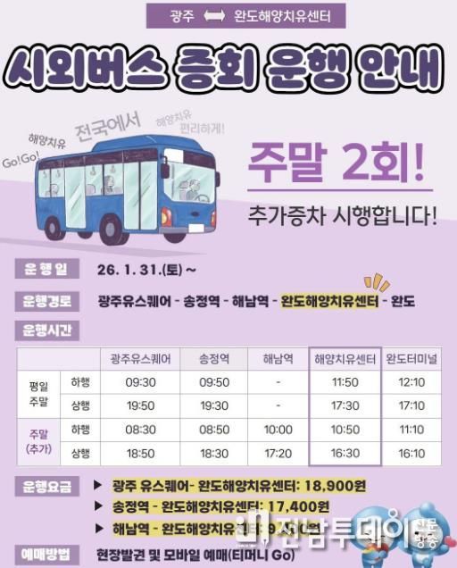 요금은 기존과 동일하며 광주(유스퀘어)↔완도해양치유센터 18,900원, 광주 송정역↔완도해양치유센터 17,400원, 해남역↔완도해양치유센터 9,400원이다.