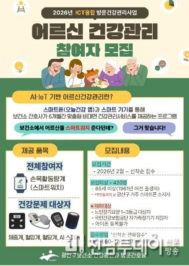 전남투데이 김경민 기자 | 광주 광산구가 65세 이상 어르신을 대상으로 인공지능(AI)·사물인터넷(IoT) 기반 어르신 건강관리 사업 신규 참여자 420명을 선착순 모집한다.
