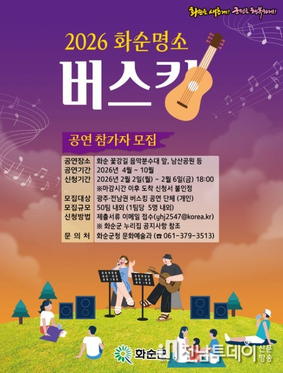 전남투데이 강영선 기자 | 화순군은 29일 지역 관광 활성화와 일상 속 문화 향유 기회 확대를 위해 ‘2026 화순 명소 버스킹’에 참여할 공연자를 공개모집 한다고 밝혔다.