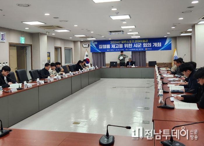 전남투데이 김용희 기자 | 전라남도는 29일 전남도체육회 대회의실에서 도, 시군, 체육 관계자 등이 참석한 가운데 2026 일반스포츠강좌이용권 시군 담당 회의를 개최, 사업의 효율적 추진과 집행률 제고를 위한 다양한 방안을 논의했다.