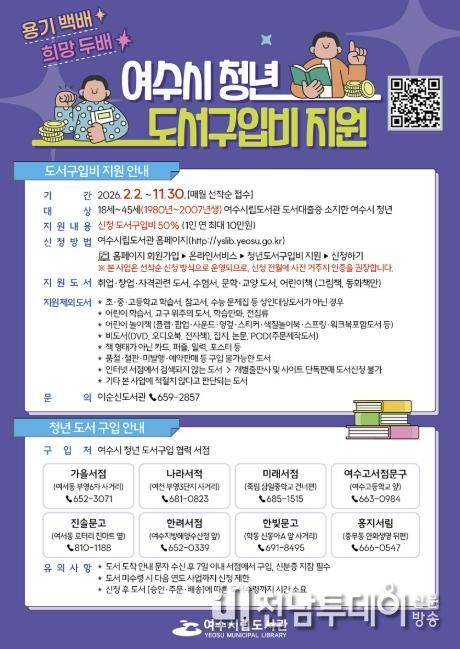 전남투데이 조평훈 기자 | 여수시는 오는 2월 2일부터 여수시에 거주하는 18~45세(1980~2007년생) 청년을 대상으로 도서구입비의 50%를 지원하는 ‘청년 도서구입비 지원사업’을 본격 추진한다.