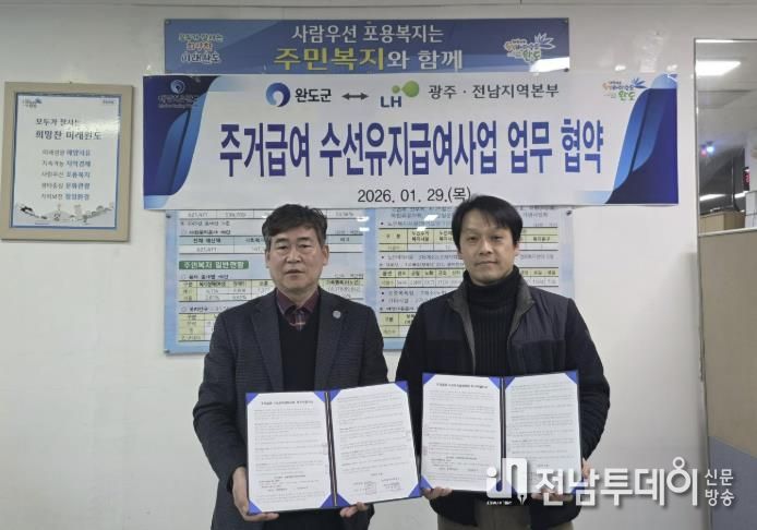 전남투데이 김용희 기자 | 완도군은 지난 29일 LH(한국토지주택공사 광주전남지역본부)와 함께 주거 급여 수급자 가구의 주거비 부담을 덜어주기 위한 업무 협약을 체결했다.