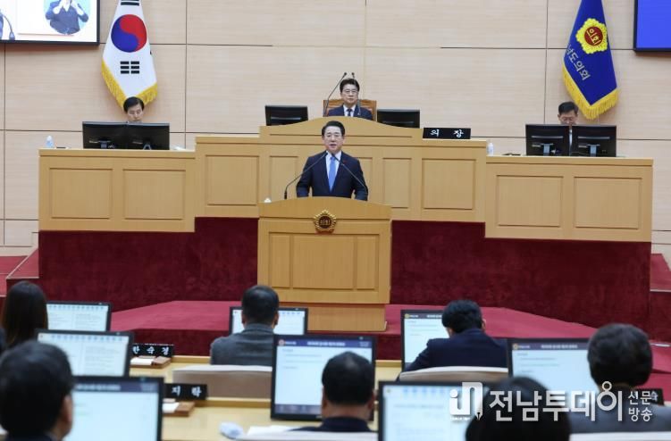 김영록 지사는 이날 제안설명을 통해 “전남·광주 행정통합은 AI·에너지 대전환 시대에 정부의 파격적 지원을 이끌어내 지역의 대부흥 시대를 열기 위한 절박함과 책임감의 산물”이라며 “산업을 일으켜 기업과 일자리가 늘어나고 청년이 돌아오는 균형발전과 번영의 선순환 구조를 만드는 것이 통합의 명확한 목적”이라고 설명했다.