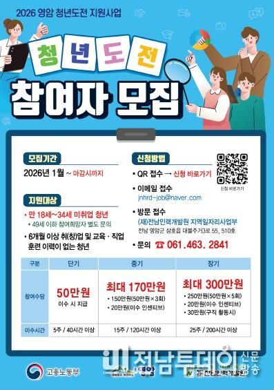 전남투데이 박상훈 기자 | 영암군이 (재)전남인력개발원과 ‘2026년 영암군 청년 도전 지원사업’ 참여자를 모집 중이다.
