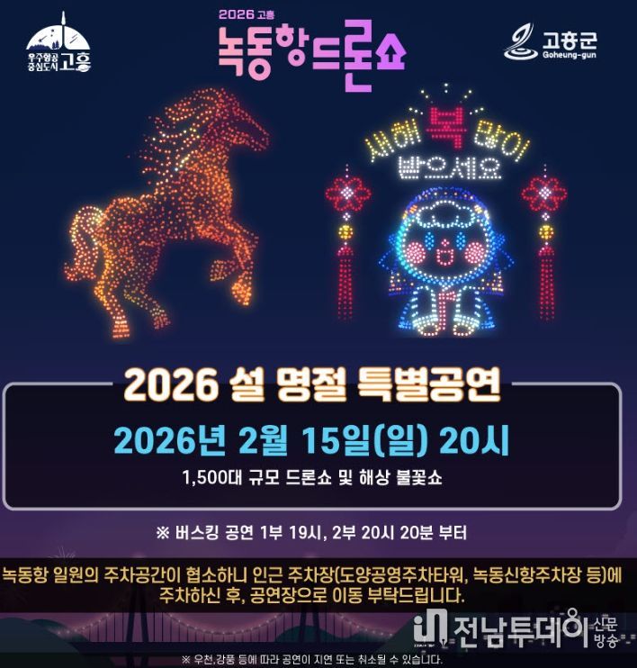 설 특별공연은 기상 상황에 따라 지연되거나 취소될 수 있으며, 정확한 공연 일정은 고흥군 대표 누리집과 녹동항 드론쇼 누리집, 인스타그램을 통해 확인할 수 있다.