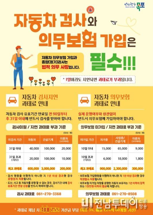 전남투데이 김용희 기자 | 목포시가 자동차 검사 미이행과 의무보험 미가입으로 인한 과태료 부담을 사전에 예방하기 위해 집중 홍보에 나서고 있다.