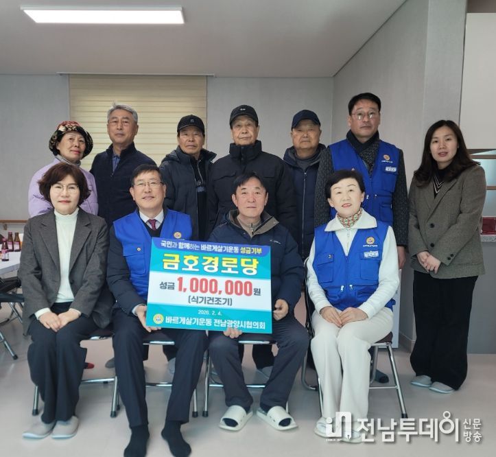 전남투데이 조평훈 기자 | 바르게살기운동 광양시협의회(회장 이승안)가 지난 4일 새로 개소한 금호경로당(회장 김원태)을 방문해 어르신들을 위한 성금 100만 원을 전달하며 이웃사랑을 실천했다.