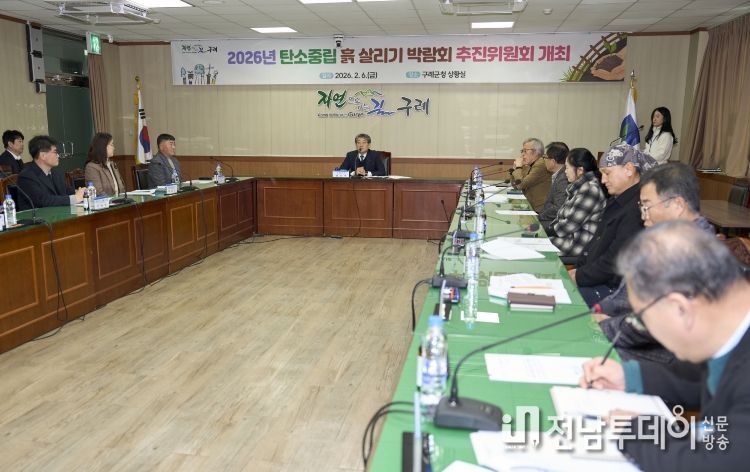 전남투데이 강길수 기자 | 전남 구례군은 2월 6일 구례군청 상황실에서 탄소중립 실천과 지속 가능한 농업환경 조성을 위한‘2026 탄소중립 흙 살리기 박람회’의 성공적인 개최를 위해 박람회 추진위원회가 첫 회의를 열었다.