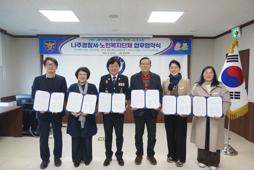 전남투데이 김윤걸 기자 | 나주경찰서(서장 권석진)는 4일 경찰서 회의실에서 대한노인회 나주시지회 등 5개 노인복지단체 총 25명이 참석하여 ‘고령자 교통안전 확보 및 사고 없는 안전한 나주를 위한 업무협약’을 체결했다.