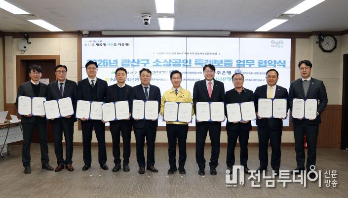 전남투데이 김경민 기자 | 광주 광산구가 6일 구청 2층 회의실에서 광주신용보증재단, 지역 금융기관 8개소(△광주어룡신협·광주하남신협·우산신협 △광주은행 △하나은행 △농협△서광주새마을금고·한마음새마을금고)와 함께 ‘2026년 광산구 소상공인 특례보증 업무협약’을 체결했다.