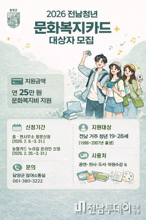 전남투데이 허은석 기자 | 담양군은 관내 청년을 대상으로 문화생활 향유 및 자기 계발 기회를 제공하고자 전남청년 문화복지카드 지원사업을 추진한다고 9일 밝혔다.