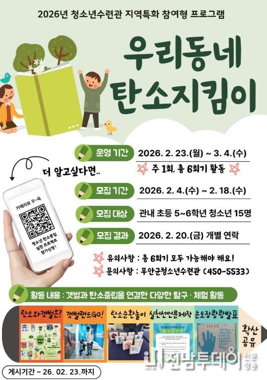 모집 대상은 무안군 관내 초등학교 5~6학년 청소년이며, 신청은 2월 18일까지 선착순으로 접수한다.