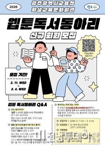 전남투데이 김경민 기자 | 광주시교육청학생교육문화회관은 오는 11일부터 3월 4일까지 12~16세 청소년을 대상으로 자율 활동 중심의 ‘웹툰 독서동아리’ 회원을 모집한다.