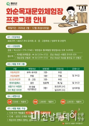 전남투데이 강영선 기자 | 화순군은 군민의 창의적인 여가 활동과 목공문화 활성을 위해 오는 2월 13일부터 화순목재문화체험장에서 목공예 체험 프로그램을 본격 운영한다고 밝혔다.