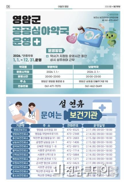 설 명절 연휴 기간 문 여는 병·의원과 약국은 영암군 반상회보 ‘월간영암’ 2월호, 영암군홈페이지 열린군정'영암소식'반상회보(월간영암)에서 볼 수 있다.