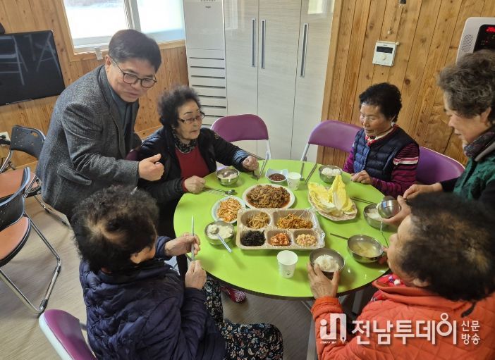 칠량면 강성남 면장이 지난 9일 칠량면 목암마을 경로당을 직접 방문해 어르신들과 함께 식사 현장을 살피며 사업 추진 상황을 점검했다.