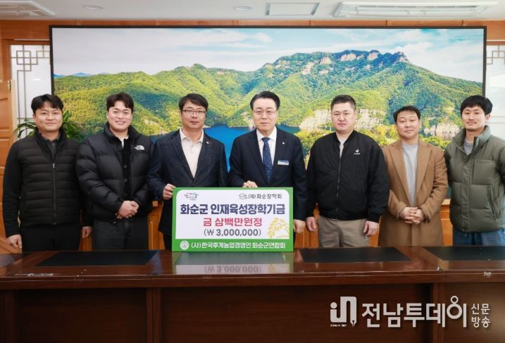 전남투데이 강영선 기자 | 화순군은 지난 9일 한국후계농업경영인 화순군연합회(회장 이태수)가 지역인재 육성을 위해 화순장학회에 장학금 300만 원을 기탁했다고 밝혔다.