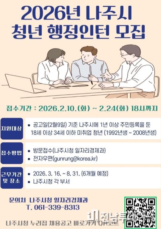 전남투데이 김윤걸 기자 | 전라남도 나주시가 청년들에게 안정적인 행정 실무 경험과 취업 역량을 제공하기 위해 올해 처음으로 청년 행정인턴제를 도입하고 공개 모집에 나섰다.