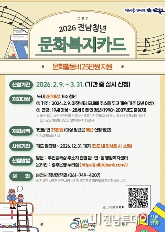 전남투데이 조평훈 기자 | 순천시는 청년들의 문화생활 향유 및 자기계발 활동을 지원하기 위해 2026년 전남청년 문화복지카드 지원사업 대상자를 오는 3월 31일까지 모집한다.