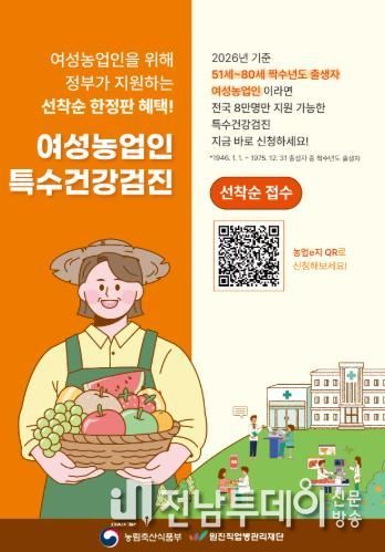 전남투데이 조평훈 기자 | 여수시는 여성농업인의 농작업 질환 예방과 건강복지 증진을 위해 ‘2026년도 여성농업인 특수건강검진 지원사업’을 시행한다고 밝혔다.