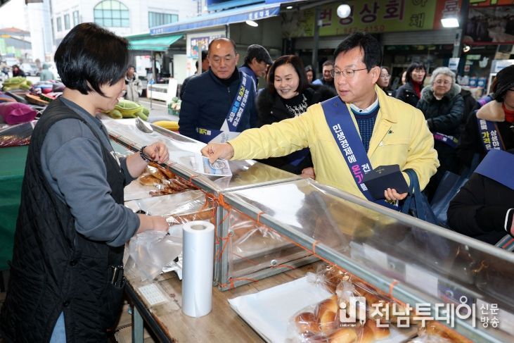 전남투데이 김경민 기자 | 박병규 광산구청장이 광산구 공직자들과 11일 송정매일시장에서 설 명절맞이 전통시장 장보기 행사와 함께 물가안정 캠페인을 진행했다.
