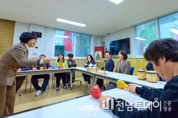 이 대통령 부부는 자리를 옮겨 주간이용시설 프로그램인 음악치료에 참여했다. 이 대통령 부부는 강사의 지도 아래 10여 명의 참석자들과 악기를 연주하며 '산골 소년의 사랑 이야기'를 합창했다.