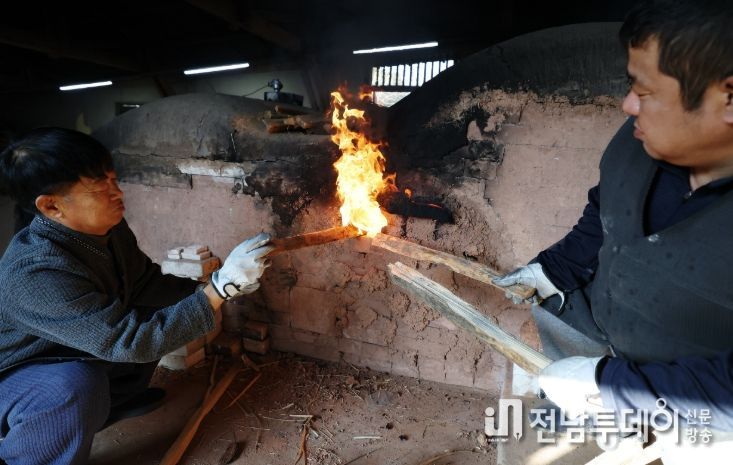 전남투데이 박동운 기자 | 제54회 강진청자축제가 오는 21일 개막을 앞두고 있는 가운데 12일 전남 강진군 대구면 고려청자박물관 제2호 가마에서 도공들이 전통 방식을 그대로 재현하며 소나무 장작을 이용해 불을 지피고 있다.