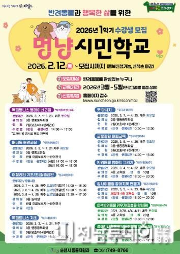 전남투데이 조평훈 기자 | 순천시는 오는 3월부터 반려동물과 반려인을 대상으로 한 시민 교육프로그램인 ‘멍냥시민학교’를 운영한다고 밝혔다.