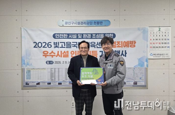 이번 인증패 전달식은 빛고을국민체육센터가 ‘범죄예방 우수시설 인증’을 획득한 결과로, 지난 2020년 광산구 공공시설 중 최초 인증 후 3연속으로 선정됐다.