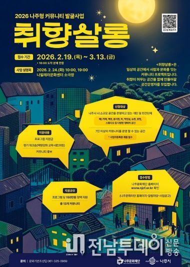 재단은 시민 주도의 생활문화를 활성화하고 지역 기반 커뮤니티를 발굴 및 육성하기 위해 2026 나주형 커뮤니티 발굴사업 ‘취향살롱’에 참여할 공간운영자를 오는 3월 13일까지 모집한다고 13일 밝혔다.