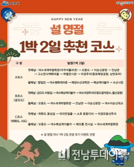 전남투데이 조평훈 기자 | 여수시가 설 명절 연휴를 맞아 가족 단위 관광객과 귀성객을 대상으로 대표 관광지를 연계한 체류형 1박 2일 코스를 홍보하고 이벤트를 진행한다.