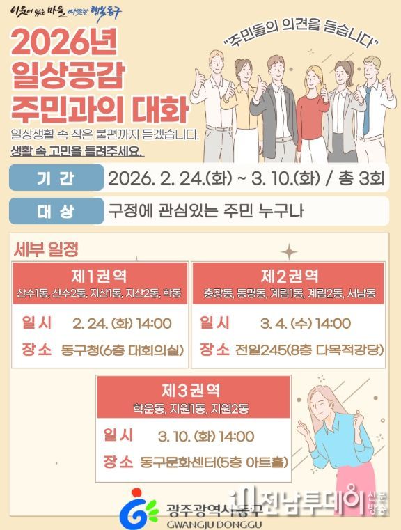 전남투데이 김경민 기자 | 광주 동구는 주민들의 일상 속 작은 불편과 생활 현안을 가까이에서 듣고 이를 구정에 적극 반영하기 위해 ‘일상공감 주민과의 대화’를 추진, 생활밀착형 소통에 나선다고 밝혔다.