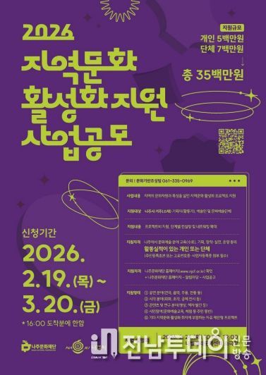 나주문화재단은 ‘2026 지역문화 활성화 지원사업’ 공모를 오는 3월 20일 오후 4시까지 진행한다고 19일 밝혔다.