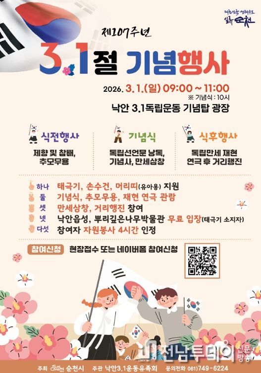 전남투데이 조평훈 기자 | 순천시는 오는 3월 1일 오전 10시, 낙안3.1독립운동기념탑 광장에서 제107주년 3.1절 기념행사를 개최한다고 밝혔다.