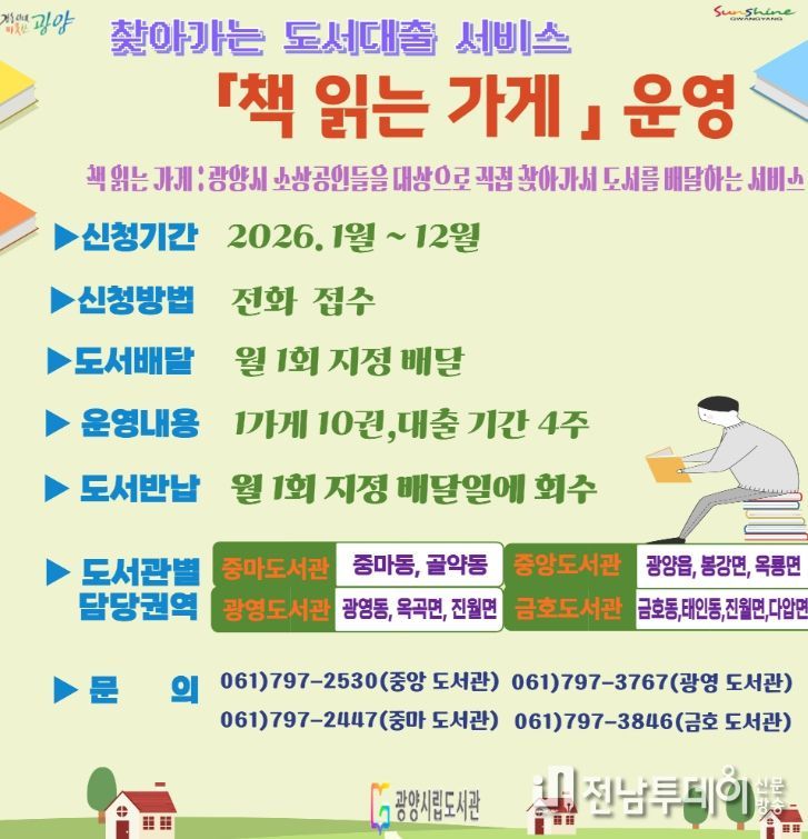 전남투데이 조평훈 기자 | 광양시립도서관은 지역사회 독서문화 확산을 위해 도서관 방문이 어려운 지역 내 소상공인을 대상으로 2026년 ‘책 읽는 가게’ 사업을 운영한다.