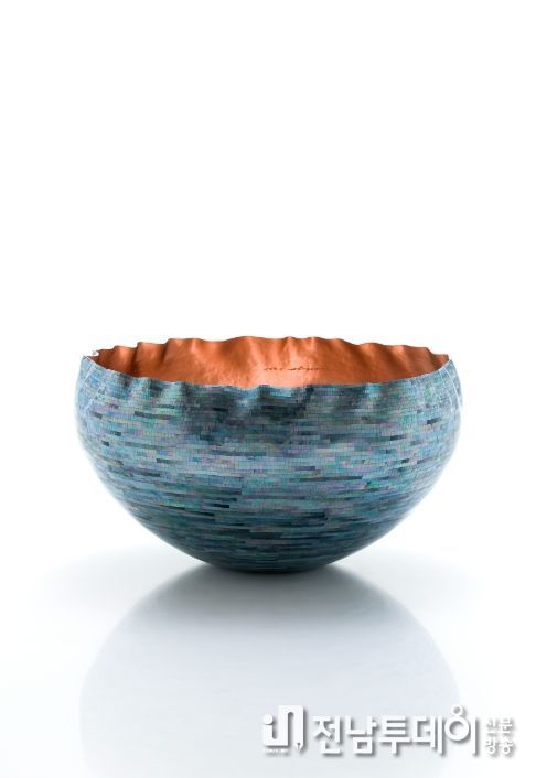 'Blue Wave No.5'는 한국 전통 자개 공예의 ‘끊음질’ 기법을 현대적으로 확장한 작품으로, 금속 기형 위에 자개를 한 조각씩 붙여 밀도 높은 표면을 구축한 것이 특징이다.