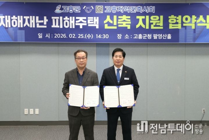 전남투데이 조평훈 기자 | 고흥군은 지난 25일 군청 팔영산홀에서 고흥지역건축사회(이하 건축사회)와 재난 피해주택 지원을 위한 업무협약을 체결했다고 밝혔다.