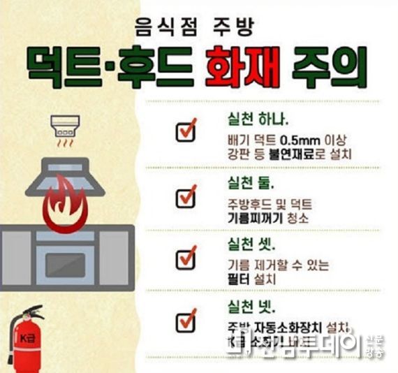 주요 내용으로 ▲배기 덕트를 0.5mm이상 강판 등 불연재료로 설치 ▲주방 후드 및 덕트 내부 기름때 정기청소 ▲기름 제거가 가능한 필터 설치 ▲주방자동소화장치 설치 및 K급 소화기 비치 등이다.