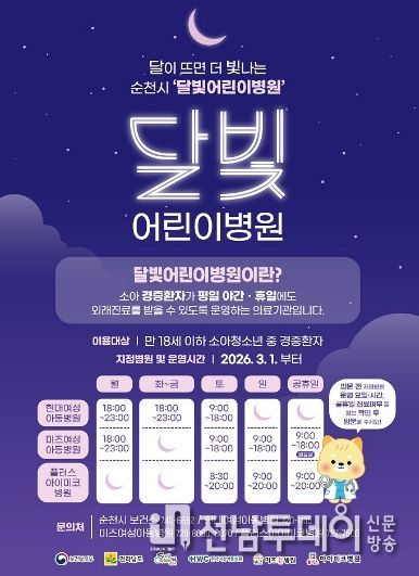 전남투데이 조평훈 기자 | 순천시는 의료 인력 부족과 심야 진료 부담 속에서도 지역 내 소아 의료공백이 발생하지 않도록 3개 달빛어린이병원을 운영하며 주 7일, 야간·휴일에도 의료공백 없는 진료체계를 유지하고 있다.