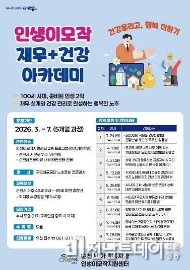 전남투데이 조평훈 기자 | 순천시는 중·장년층의 삶의 설계와 안정적인 노후 준비를 돕기 위해 ‘재무·건강 아카데미’ 수강생을 3월부터 7월까지 수시 모집한다고 밝혔다.