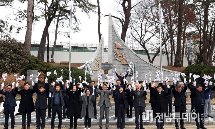 전남투데이 박동운 기자 | 1일 잃어버린 조국을 되찾기 위해 외쳤던 3.1 독립만세운동이 107주년을 맞이한 가운데 1976년 건립된 강진군 강진읍 서성리 3.1운동 기념비 앞에서 김준철 강진 부군수를 비롯해 각급 기관단체장 등 참석자들이 기념식을 갖고 대한독립 만세를 외치고 있다.