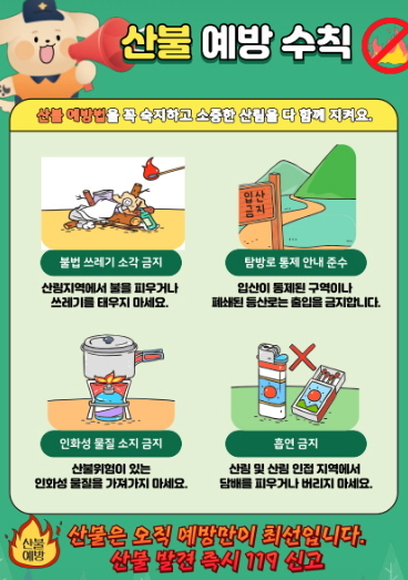 특히 산림 인접 지역에서의 영농부산물 및 생활쓰레기 소각 행위는 산불로 확산될 위험이 높아 각별한 주의가 필요하며, 입산객 또한 지정된 탐방로 이용과 화기 사용 금지 수칙을 반드시 준수해야 한다고 강조했다.