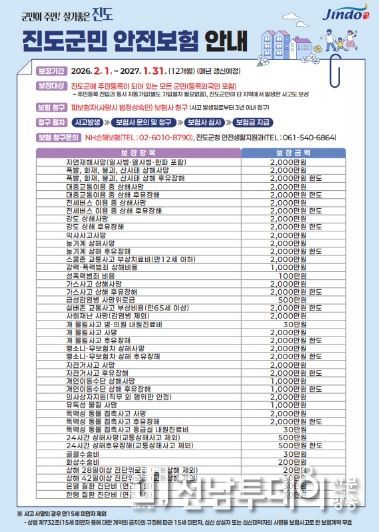 전남투데이 문경식 기자 | 진도군은 일상에서 발생하는 각종 재난과 사고로부터 군민을 보호하기 위해 군민안전보험에 매년 가입하고 있다.