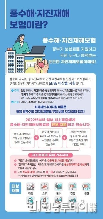 전남투데이 김용희 기자 | 전라남도는 풍수해·지진재해보험에 가입하는 취약계층의 보험료 자부담을 줄이기 위해 도비 보조금 지원을 대폭 확대한다고 밝혔다.
