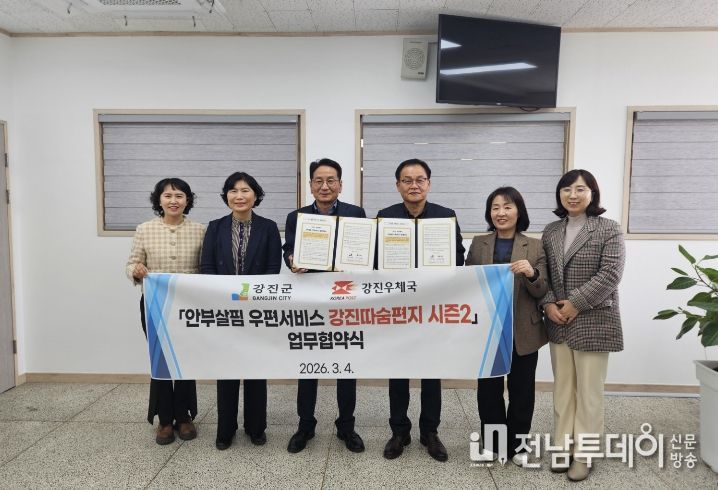 전남투데이 박동운 기자 | 강진군이 작년에 이어 올해에도 행정안전부 공모사업 ‘2026년 읍면동 스마트 복지‧안전서비스 개선 모델 개발 지원사업’의 ‘안부살핌 우편서비스’ 부문에 선정돼 국비 1천만 원과 우체국공익재단 8백만 원을 포함한 총 2천 8백만 원 규모의 예산을 투입해 촘촘한 복지 안전망 구축에 나섰다.