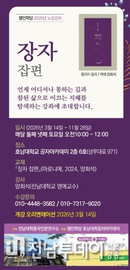 전남투데이 김용희 기자 | 전남대학교 중국인문연구소가 시민과 함께 동양 고전을 읽으며 인문학적 지혜를 나누는 ‘행인학당 2026년 노장강좌’를 개최한다.