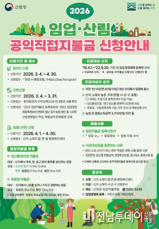 전남투데이 조평훈 기자 | 고흥군은 임업·산림의 공익기능을 증진하고 임업인의 소득 안정을 지원하기 위해 ‘2026년도 임업·산림 공익직접지불금(임업직불금)’ 등록 신청을 4월 30일까지 접수한다고 밝혔다.
