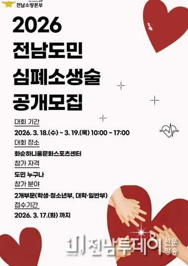 전남투데이 김용희 기자 | 전남소방본부가 도민의 응급상황 대처 능력을 높이고 생명 존중 문화를 확산하기 위해 오는 3월 17일까지 ‘제15회 일반인 심폐소생술 경연대회’ 참가팀을 전격 모집한다.